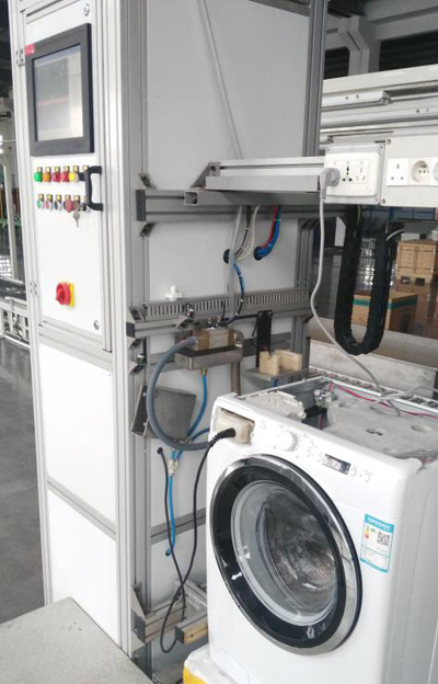 我公司自主研發(fā)的半自動(dòng)站位式功能檢測,型式為站位式運(yùn)行,洗衣機(jī)運(yùn)行至檢測工位,人工插拔進(jìn)水閥、排水管、供電插座,檢測臺(tái)位自動(dòng)運(yùn)行對滾筒洗衣機(jī)各項(xiàng)功能進(jìn)行跟蹤檢測。